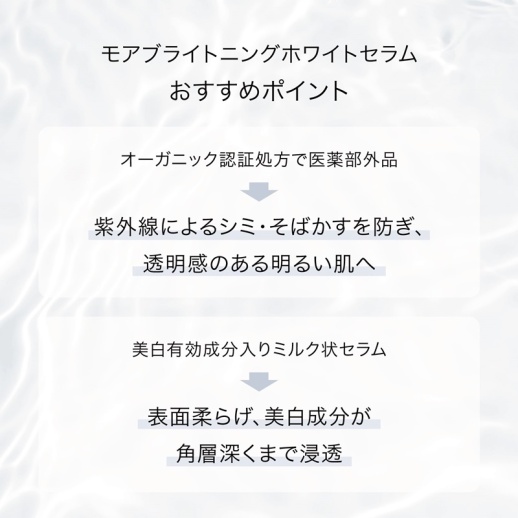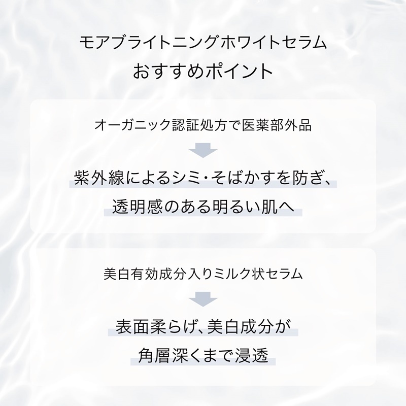 医薬部外品×COSMOS ORGANIC認証のW認証。紫外線によるシミを防ぎ、透明肌に導く、薬用美白美容液。