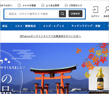 ページ上部の検索窓に商品名などのキーワードを入力し、虫眼鏡のボタンをクリックしてください。